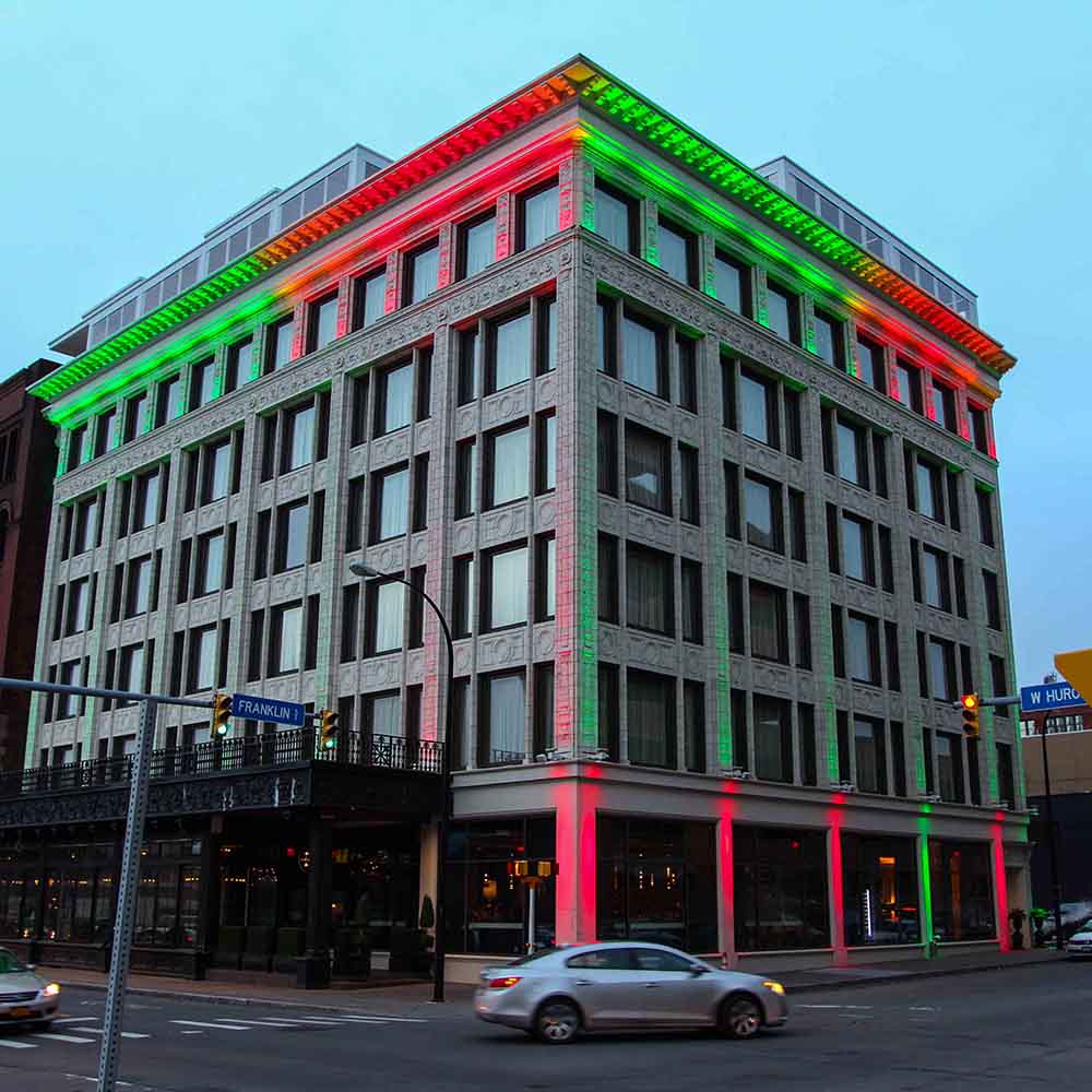 These days, the shops, restaurants and attractions that give the district vibrancy are quiet due to the ongoing COVID restrictions. But even with all of that, at the holidays, downtown’s historic architecture is decked out, both a throwback  to an earlier era and a testament to the interest in making the city shine as its revitalization looks forward to the future.