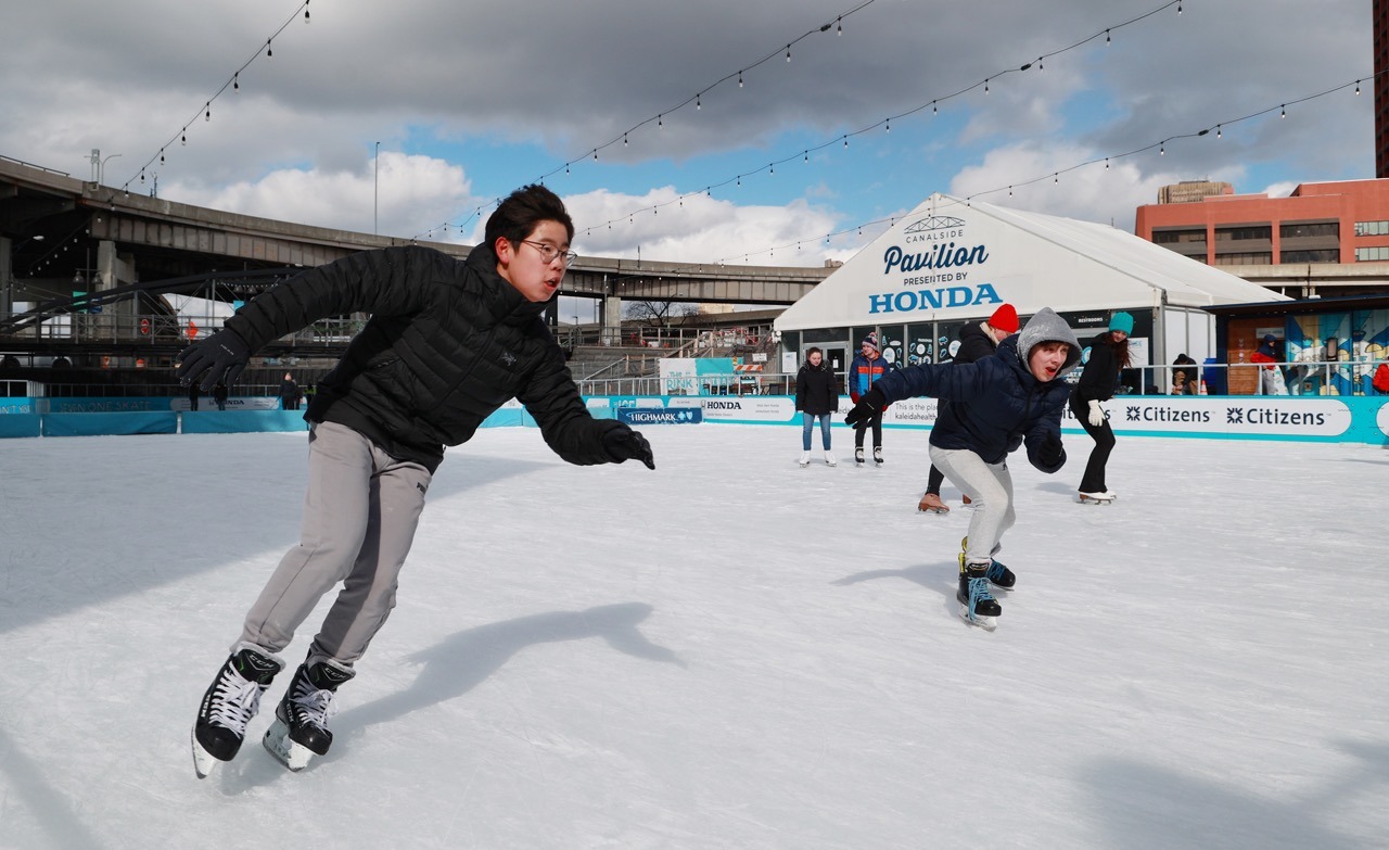 Canalside, Buffalo’s beloved summertime destination and the linchpin of the city’s revitalized waterfront, transforms when the temperatures dip below freezing. Festivals in the summer sun and paddleboats in the replica Erie Canal waterways make way for wintry outdoor activities and 33,000 square feet of ice to skate, curl and bike (yes, bike) upon. Here are all the ways to experience Canalside this winter: