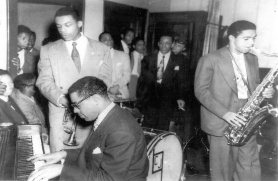 The early 1950s photo shows Davis peering over John Coltrane’s shoulder. Dizzy Gillespie is at the piano. A local musician Elvin Shepherd watches, trumpet in hand. His friend Wilbur Trammel plays the saxophone. A small crowd listens in.