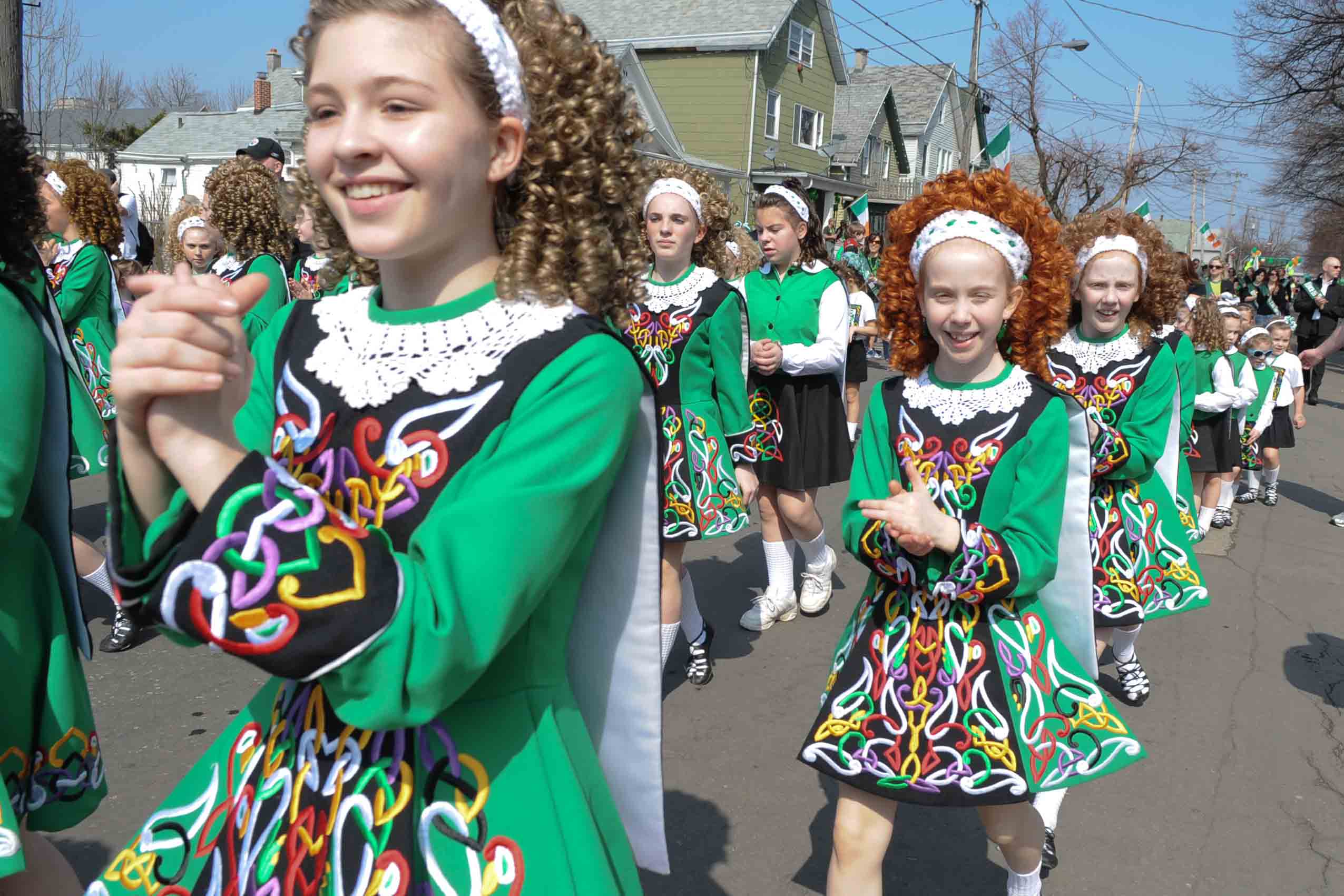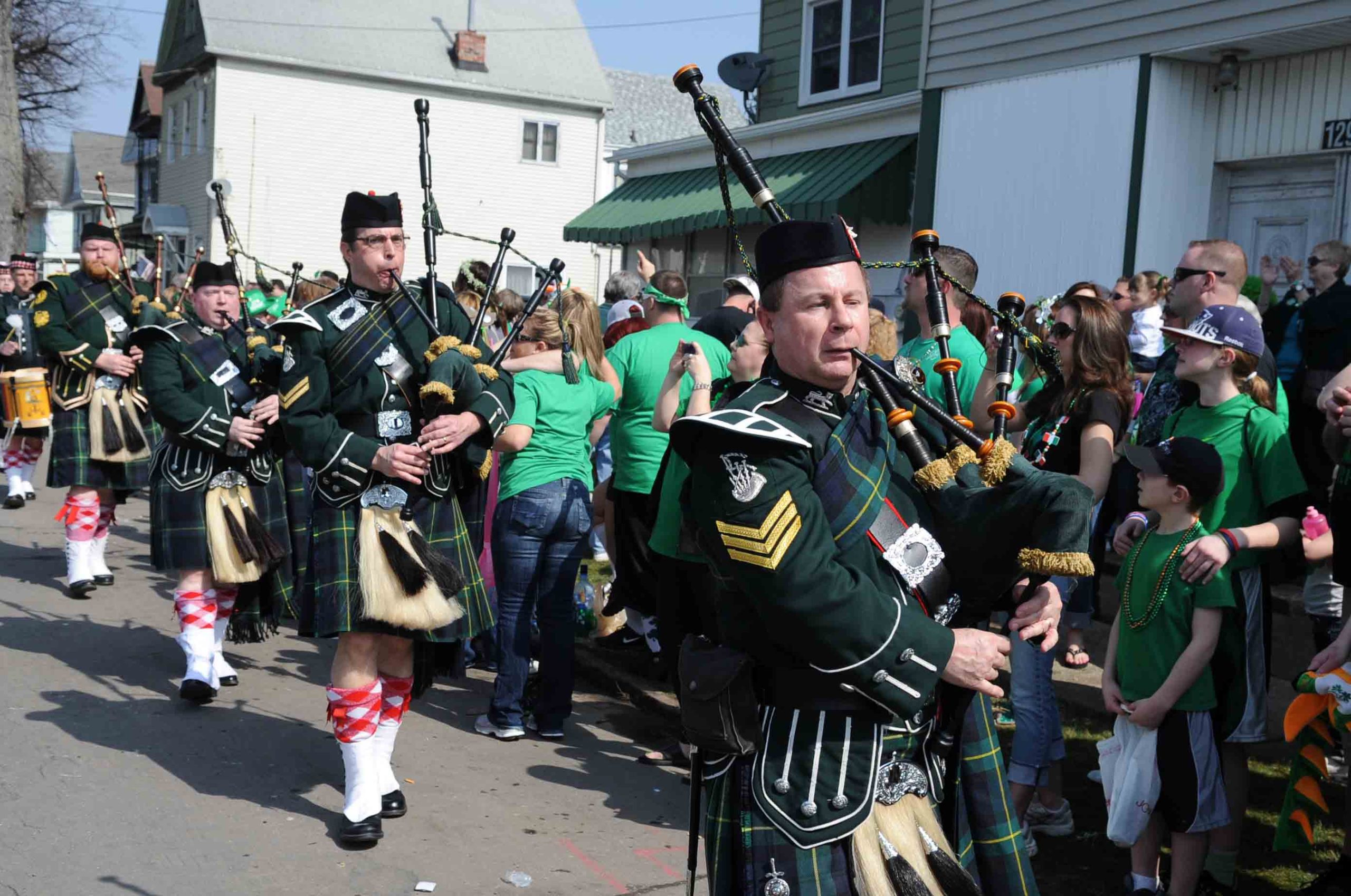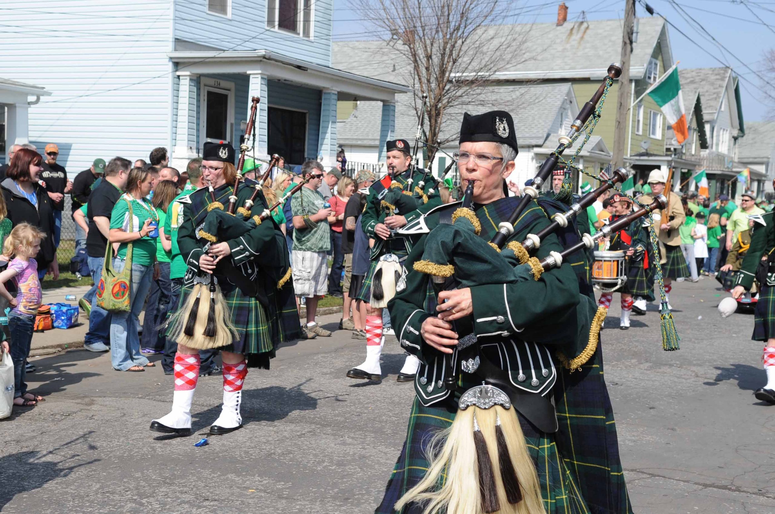 At downtown’s more than century-old parade down Delaware Avenue, you’ll see parents and children, huddled in green off city sidewalks as processions of parade floats stream past thousands of revelers. Those nestled in the First Ward do the same, but often from their front lawns or stoops, gathered with extended family at middle-class houses as pipes, drums and festively dressed neighbors wind down South Park toward Hamburg and Louisiana streets.