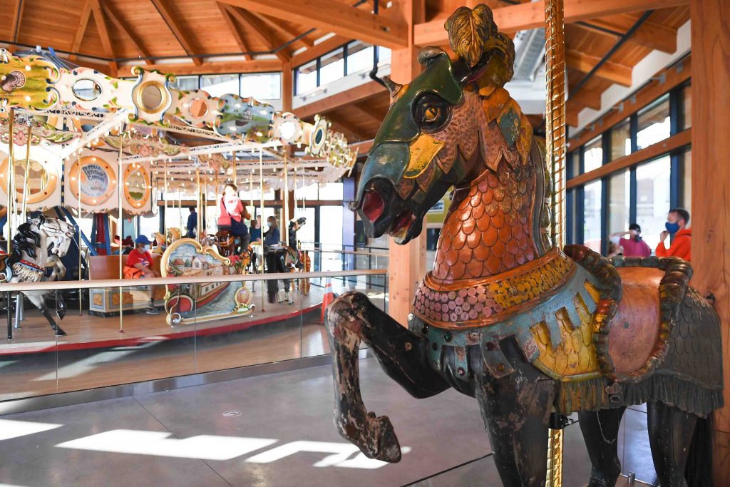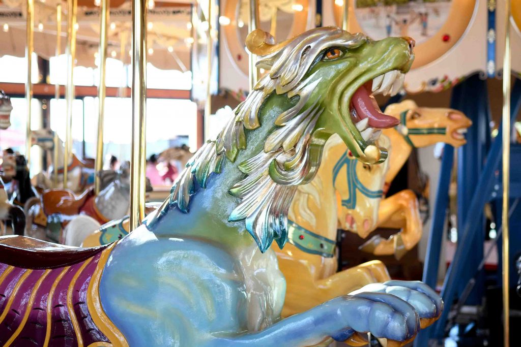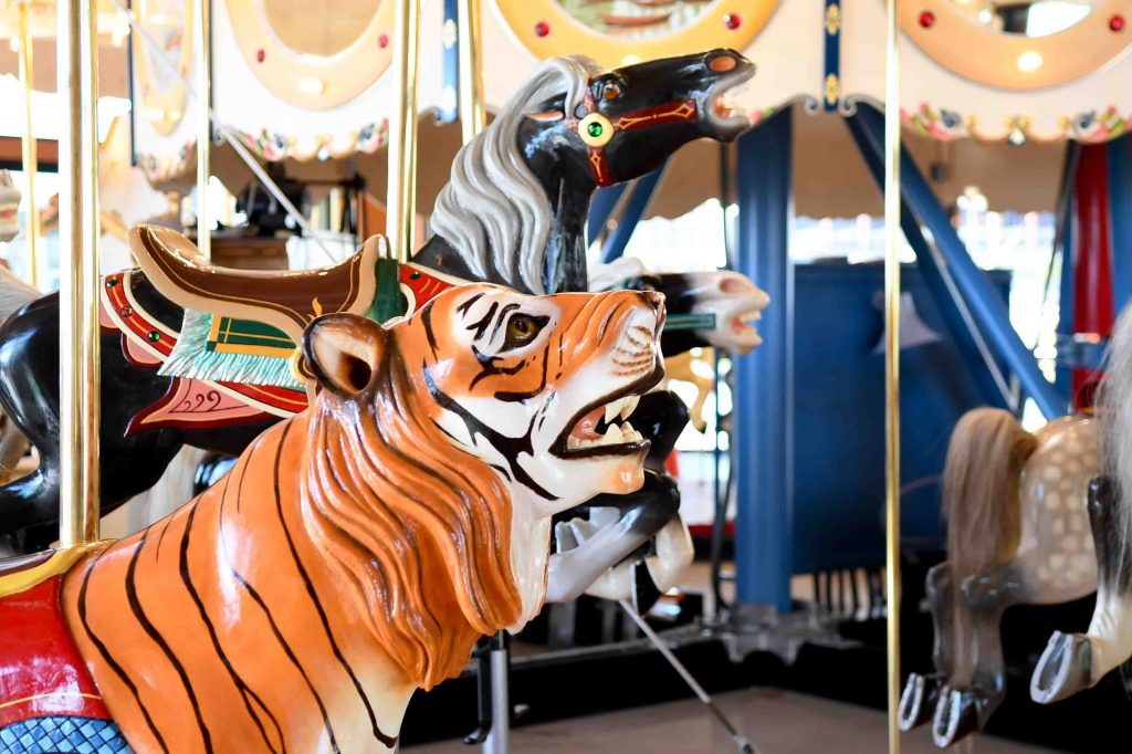 Storybook magic is woven throughout the carousel’s history. It was hand-carved by artisans in North Tonawanda – approximately 14 miles from where it is now sited – at Spillman Engineering Corporation. That local company, founded in the 19th-century, has a complicated history of mergers, splits, and moves while creating carousel components non-stop. It was built a few blocks from where it was restored, in a large, airy space at Herschell Carrousel Factory Museum on Thompson Street.