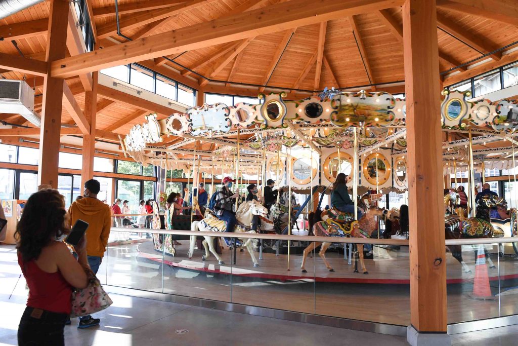 Tesla solar panels keep the menagerie running smoothly in an eco-friendly, sustainable way. A control panel near the carousel on a wall not far from what is referred to as the “Lead Horse” (he’s regal and remains unrestored, showing the intensive work done by specialists and volunteers on his nearby, working counterparts), reports – in real time – kilowatt energy created by the waterfront sunshine, and stored and expressed by the solar panel technology on the roof.