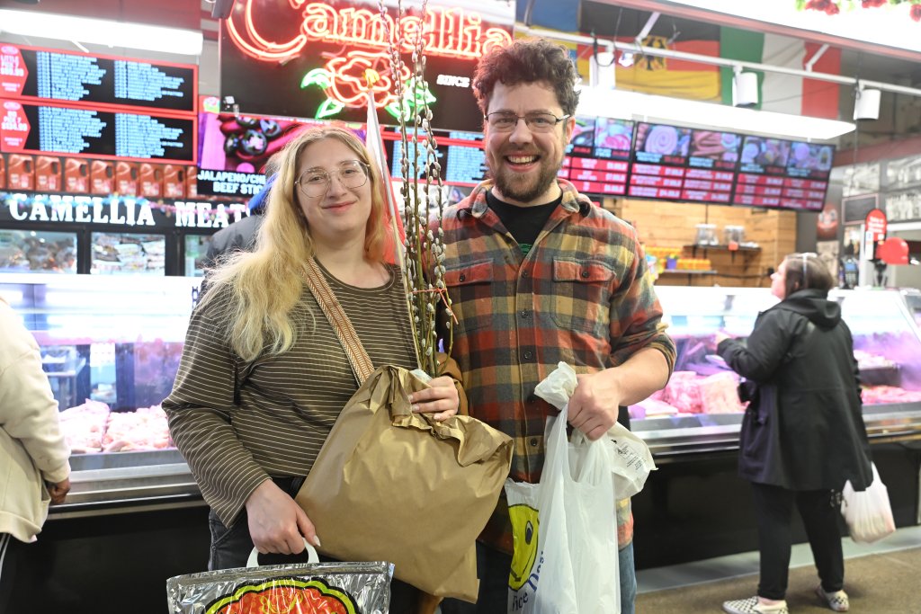 A market institution since 1935, Camellia’s Broadway Market stand is known for sausages, smoked hams, prime rib, and rack of lamb. Veteran employee Elaine Pasternak, a mainstay at the market for more than four decades, rings in the season wearing festive earrings and a signature holiday hat.