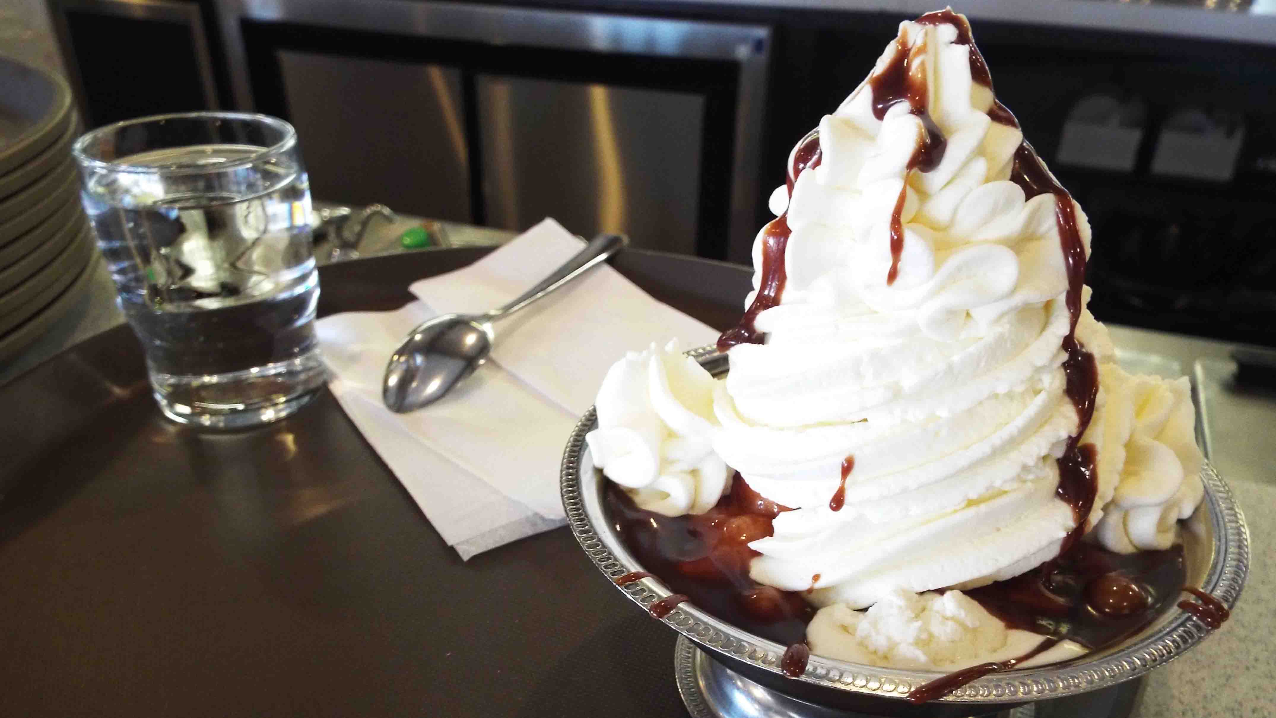It starts with a large scoop of smooth and creamy homemade vanilla ice cream as the base. Then hot homemade fudge is generously poured over the ice cream. If you answer yes to, “Do you want whipped cream?” you’ll then receive an extremely generous helping of the thick, homemade heavy-cream-and-sugar whipped cream on top and dolloped around the edges. But you’re not done just yet. Drizzle a little hot fudge over the top for good measure and serve with a glass of water. Voila!