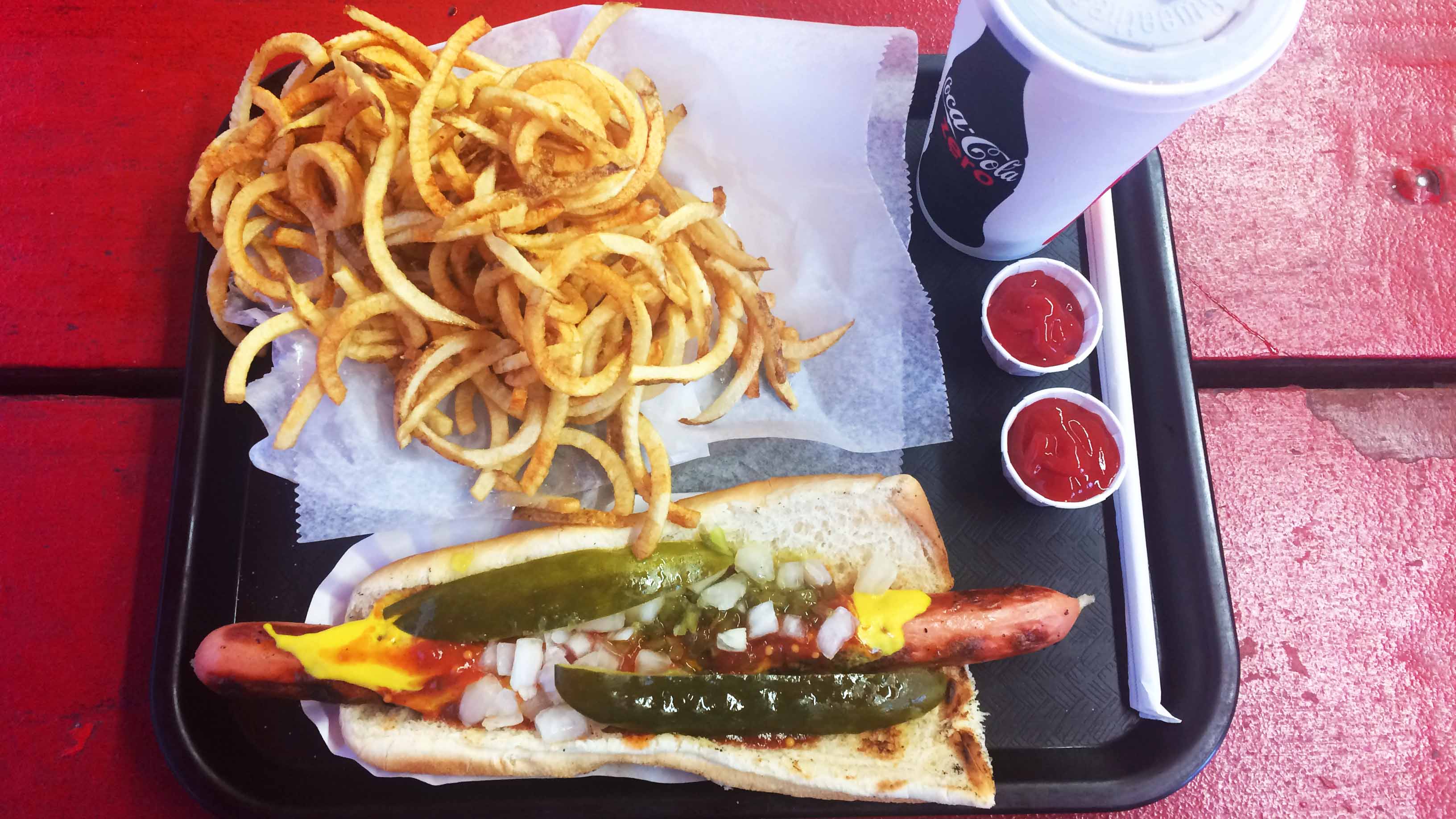 Although the menu has grown to include a variety of hot dogs, burgers and sandwiches, Angelo recommended the classics to me: their signature foot-long with “the works” – a mix of mustard, ketchup, relish, chopped onions and crisp pickle spears – and a generous serving of freshly-cut curly fries.