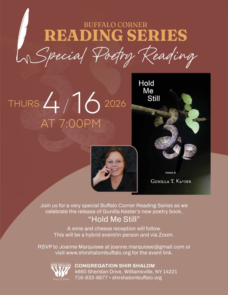 Buffalo Corner Reading Series presents a special event with poet Gunilla Kester. Gunilla will read selections from her newly published book, Hold Me Still, published by Main Street Rag Publishing Company. A...