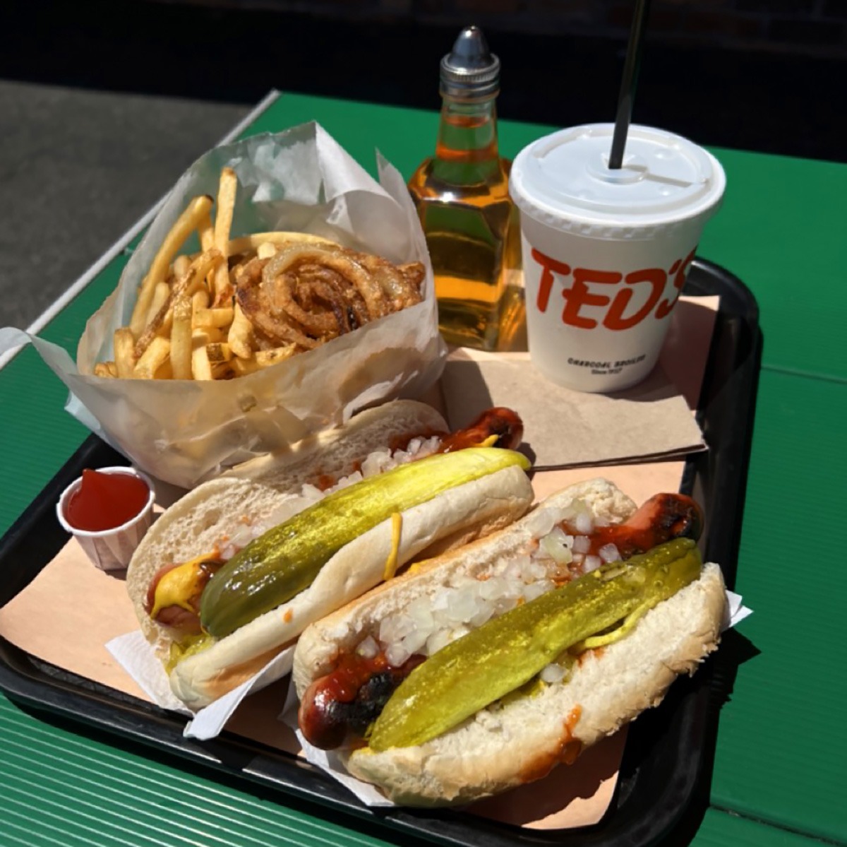 Customers line up to place their order at the front grill, then watch as Ted’s grill masters deftly sear Sahlen’s hot dogs, footlongs, burgers, chicken, and Mineo & Sapio sausage over an open flame. Some order their hot dogs “extra charred,” as the charcoal grilling causes them to darken and snap open with an extra smoky flavor. Ask for the “works” on your hot dog – including Ted’s signature, housemade hot relish – and complete your meal with an order of onion rings, a recipe Ted’s modeled after a now defunct local restaurant, Garlock’s. Then wash it all down with a loganberry drink for an unrivaled experience of American roadside food.