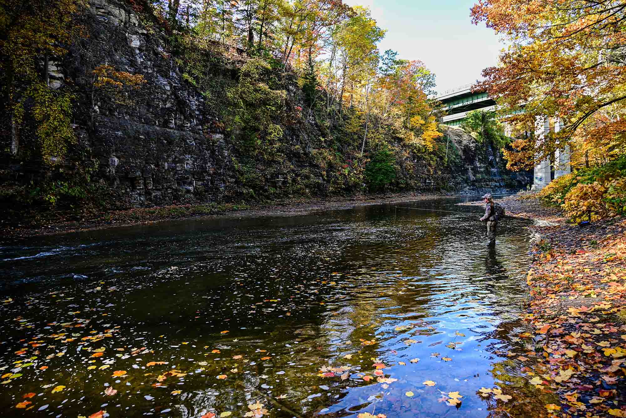We arranged to meet Hageman at the Route 20 access site. When we pulled up we were the only two cars at this popular fishing spot with a weather forecast showing some rain. We quickly geared up, walked down the hill and were at the first hole in minutes. We stopped under the I-90/New York State Thruway Bridge and Hageman pointed into the deep pool under some moving water.
