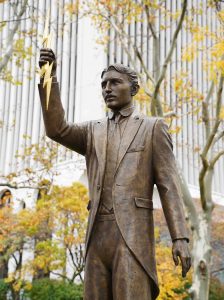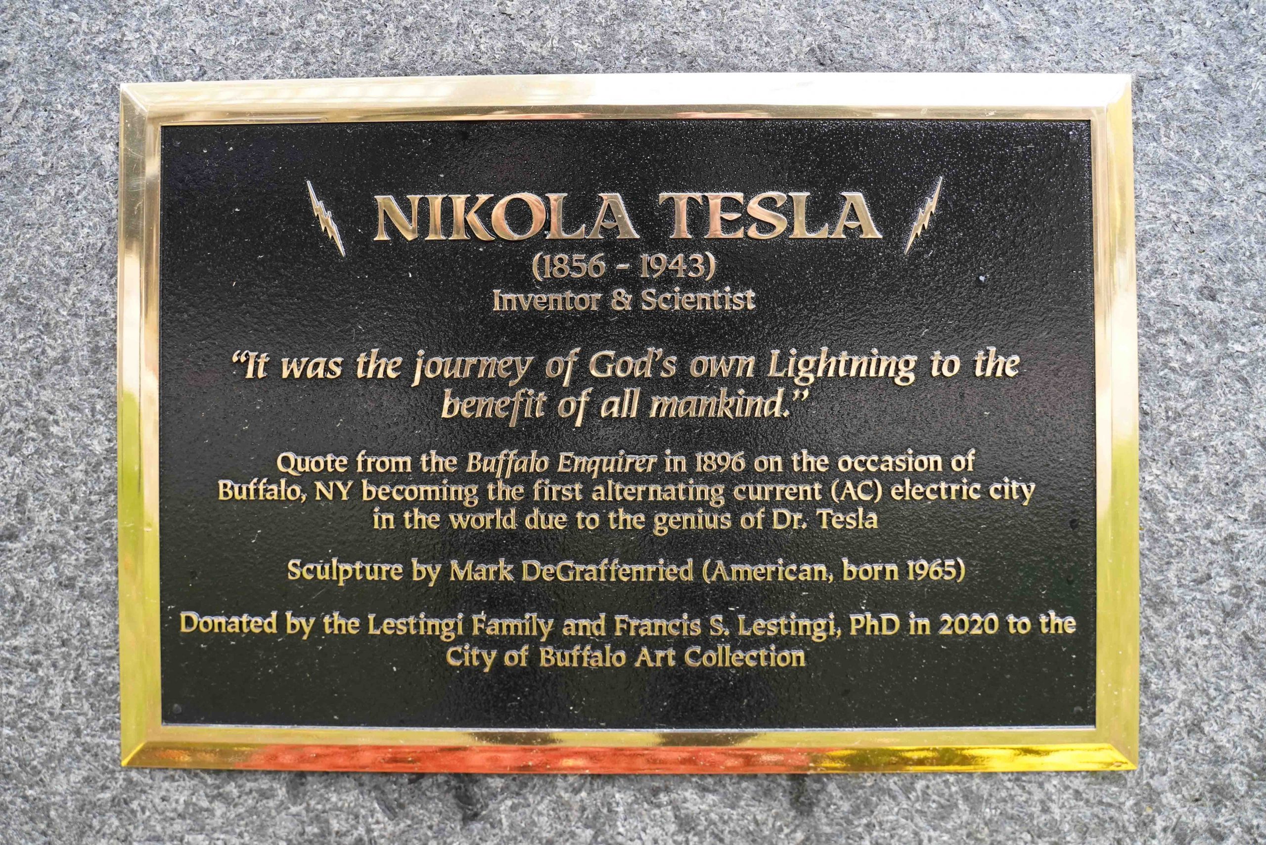 On November 16, 1896 inventor Nikola Tesla flipped the switch that made Buffalo the first electrified city in the world. This first long-distance transmission of alternating current (AC) electricity helped power Buffalo’s street cars and light up its streets and it wasn’t long before the entire world was electrified using Tesla’s innovations. This momentous occasion and the man who made it possible have been honored with a new statue in downtown Buffalo at the corner of Main Street and North Division. The location of the statue has been officially declared Nikola Tesla Park by the City of Buffalo.