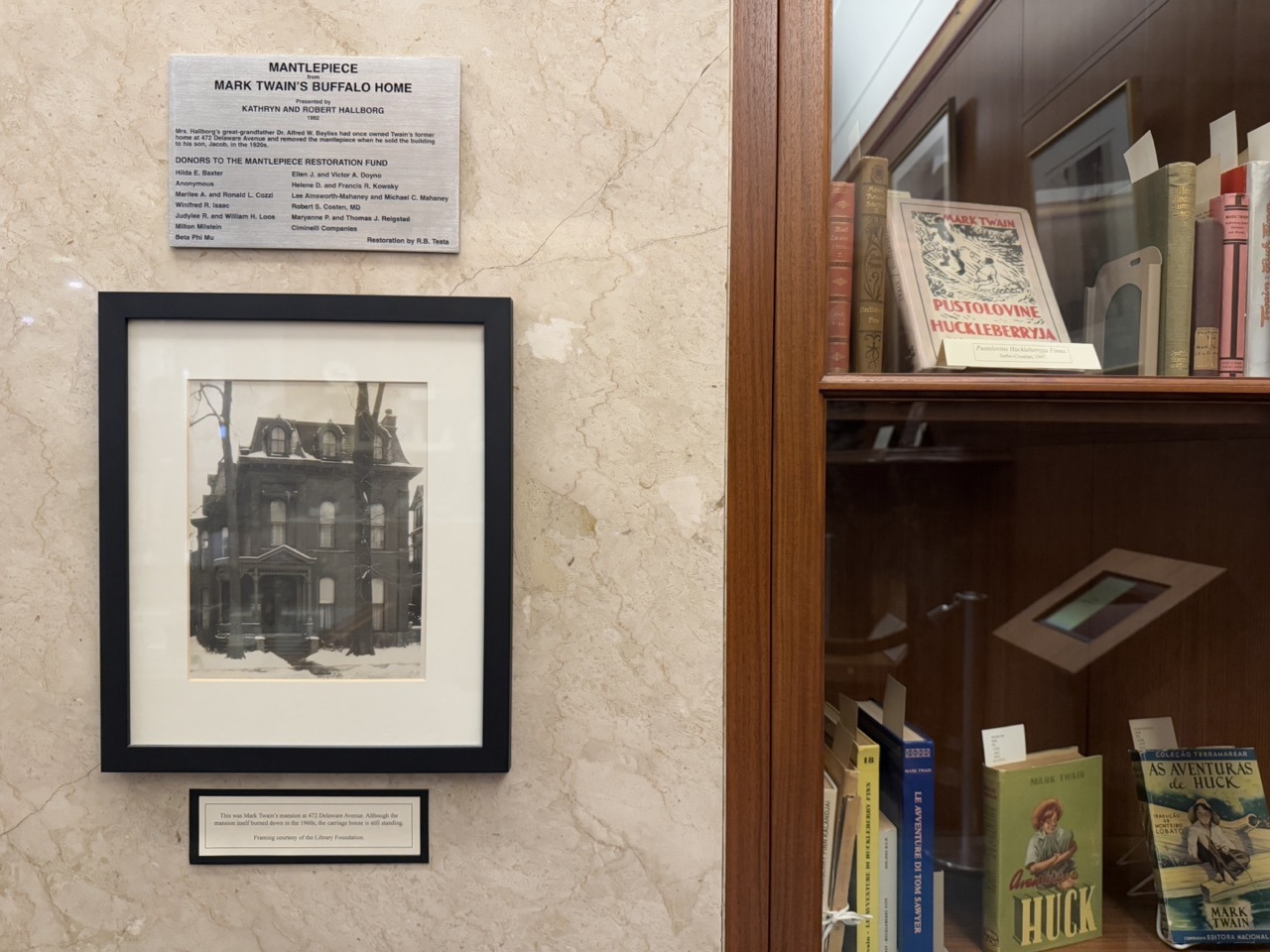 The Central Library’s Mark Twain Room, found on its first floor and free and open to the public, is a veritable shrine to the legendary American author. Inside the converted former smoker’s lounge, you’ll discover many objects from the library’s extensive collection of Twain-related memorabilia lining its shelves, from Twain-branded cigars and foreign language editions of his books to a copy of the 1891 game he patented, “Mark Twain’s Memory Builder.” The exhibit space even features the preserved fireplace from the long-demolished Delaware Avenue home where Twain lived with his wife during a brief stint in Buffalo as a newspaper editor in the early 1870s.