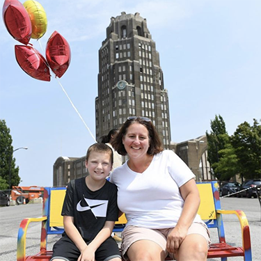 Visiting Buffalo Central Terminal for the first time was mom-son travel team Jennifer and James from Bloomington, Illinois. They were checking out several PLAY/GROUND 2021 sites that they’d learned about online. They were also happy to see – and participate in – what the PLAY/GROUND website called “A community-involved art project where we prime, install and paint park benches,” featuring the work of five artists on ready-for-sitting park benches. Jennifer and James were seated on the bench by artist Lisa Brown, with the message “The Gathering Place” on its back. “We heard about PLAY/GROUND on Visit Buffalo Niagara’s site,” says Jennifer. “We’re in Buffalo for five days and have been finding fun activities for each day. We visited, and loved, Canalside and we rented paddleboats. We also went to see Niagara Falls at night.” “We really like that Canalside is a great place to chill and the paddleboats were super-reasonably priced,” adds James. “It’s a great place to relax and be in the city, it’s so easy here to get outside.”