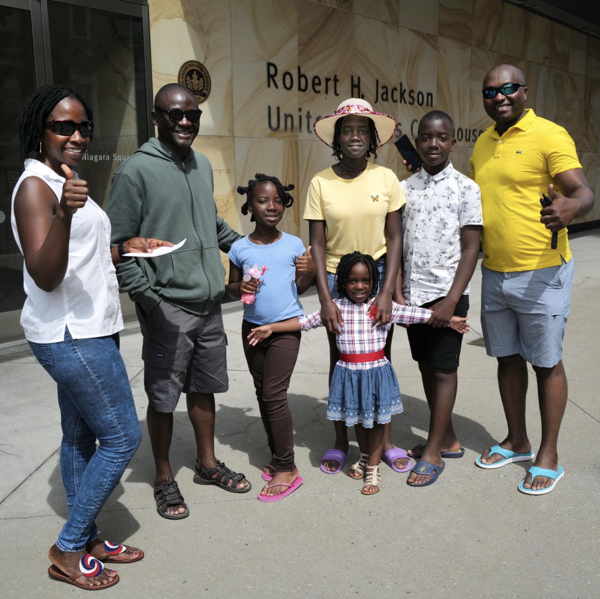 A group of seven family members (Juny, Marcelle, Shanice, Henri, Judy-Dorés, Edna, and Ernest), who traveled via car to Buffalo from Ouest Pierrefonds, Quebec, wanted “To see the second-largest city in New York State,” says Judy-Dorés, adding “we had friends who came to Buffalo and loved it – and recommended it to us. Everybody is talking about Buffalo.” The family was seen posing for photos alongside Buffalo’s Robert H. Jackson U.S. Federal courthouse on Niagara Square, admiring its etched glass copy of the U.S. Constitution and yellow stone. Henri (in yellow shirt), who works in Canadian immigration, said he and his family “Went to Niagara Falls, and we saw both sides, it’s all so beautiful.” Shanice, Henri’s daughter, says “We had very delicious Vietnamese food in Amherst outside of Buffalo, at Red Pepper. I liked my fried vegetables and noodles so much I photographed them and posted them on my social media.” Spending two days in Buffalo, not too far away in a downtown hotel, the family was also headed to Canalside, which they had heard about through their friends, and were looking forward to admiring more of the city architecture – downtown and in different neighborhoods.