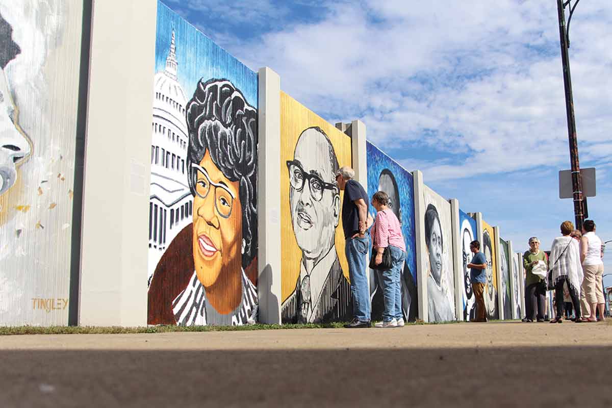 The Freedom Wall,1525 Michigan Ave. A 2017 portrait mural by local artists celebrate leaders – from Rosa Parks and Angela Davis to W.E.B. Du Bois and Thurgood Marshall – and span a corner of a bus maintenance depot at one end of the Michigan Street African American Heritage Corridor.