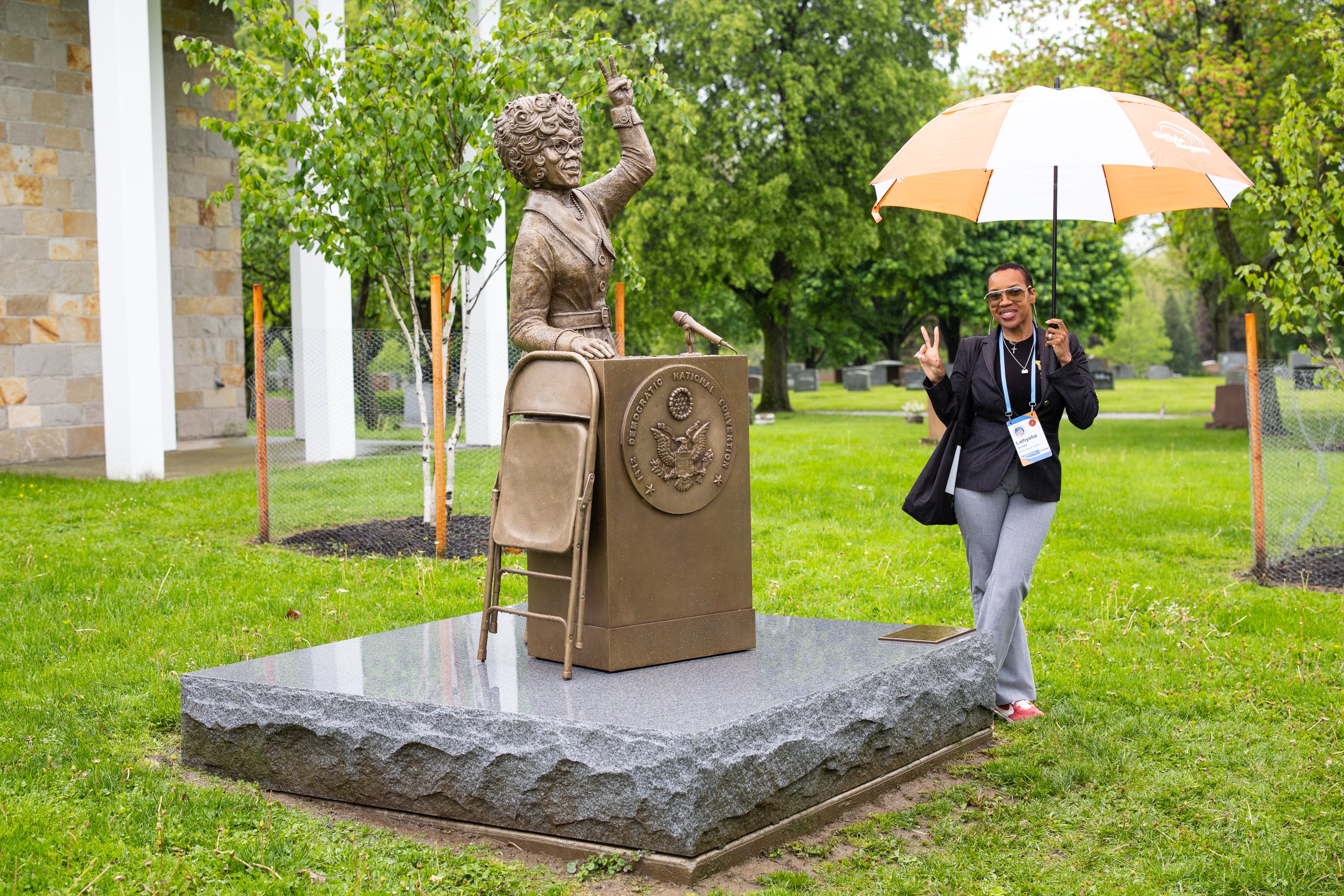 This Shirley Chisholm statue by Julia Bottoms, 1990 Main St., marks the resting place at Forest Lawn Cemetery’s Birchwood Mausoleum of the first Black woman elected to Congress. A Brooklyn-native, she moved to Buffalo after marrying a former state legislator. Find the reminder of her quip, “If they don’t give you a seat at the table, bring a folding chair.”