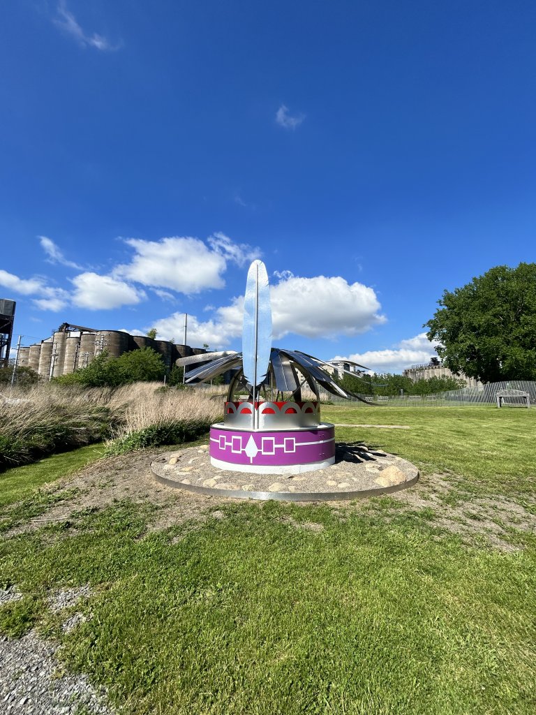 Gastowë’ 85 Silo City Row, is the Seneca word for headdress. This 16-foot version by Seneca artist Bill Crouse is made from patterned steel by Rigidized Metals, the neighbor, and owner, of the Silo City campus with century-old silos and buildings repurposed as art spaces, apartments, a music venue tavern and trails.