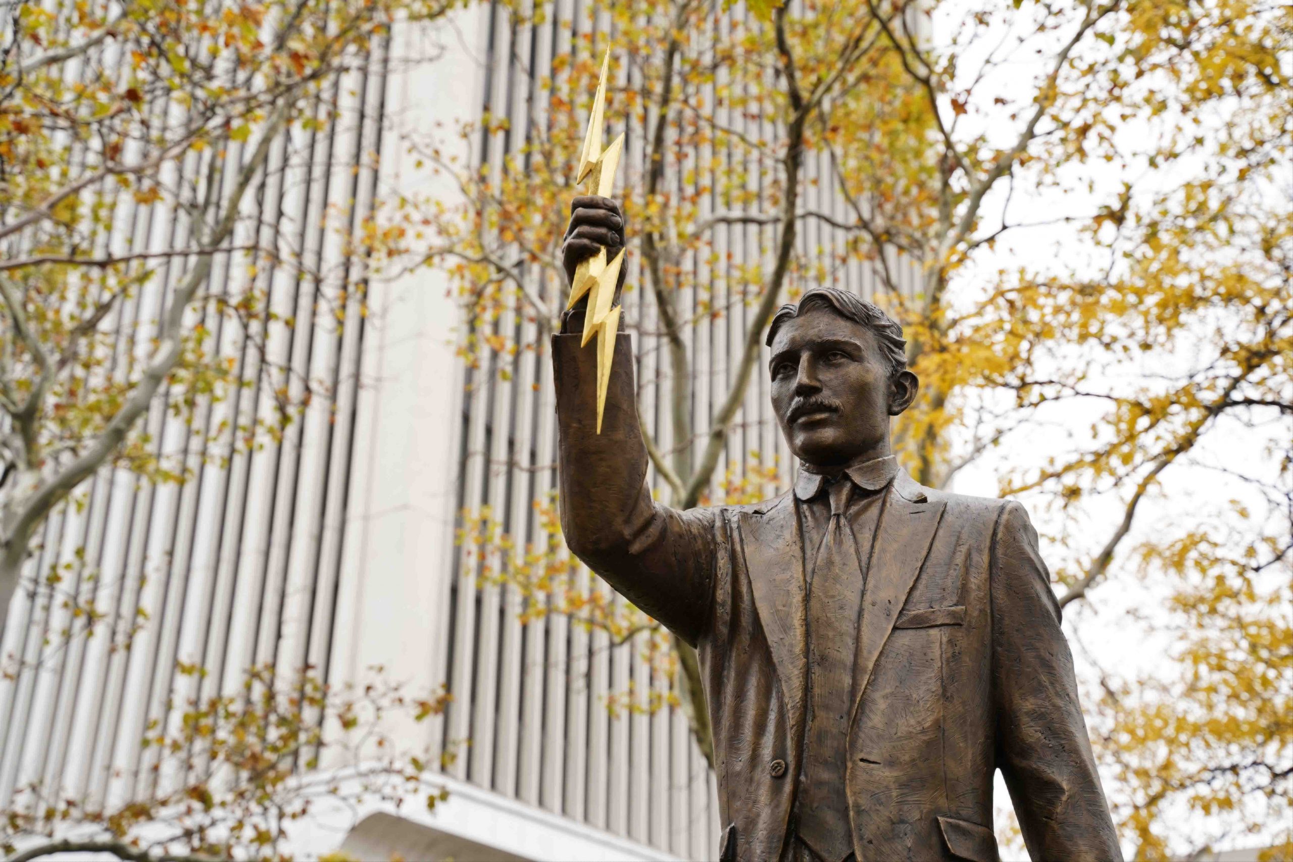 On your left, you’ll see One M&T Plaza. With its tall entryway arches and long white vertical lines, it was erected from 1964 to 1966 and designed by Minoru Yamasaki, the same architect who designed the World Trade Center twin towers in New York. Nearby you can also get a look at the recently erected Nikola Tesla statue in Nikola Tesla Park at the corner of North Division Streets. Tesla’s discovery of alternating current electricity was integral in making Buffalo an early adopter of city-wide electricity.