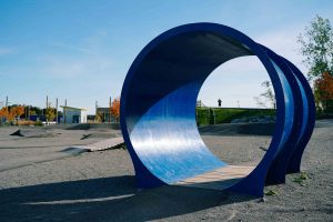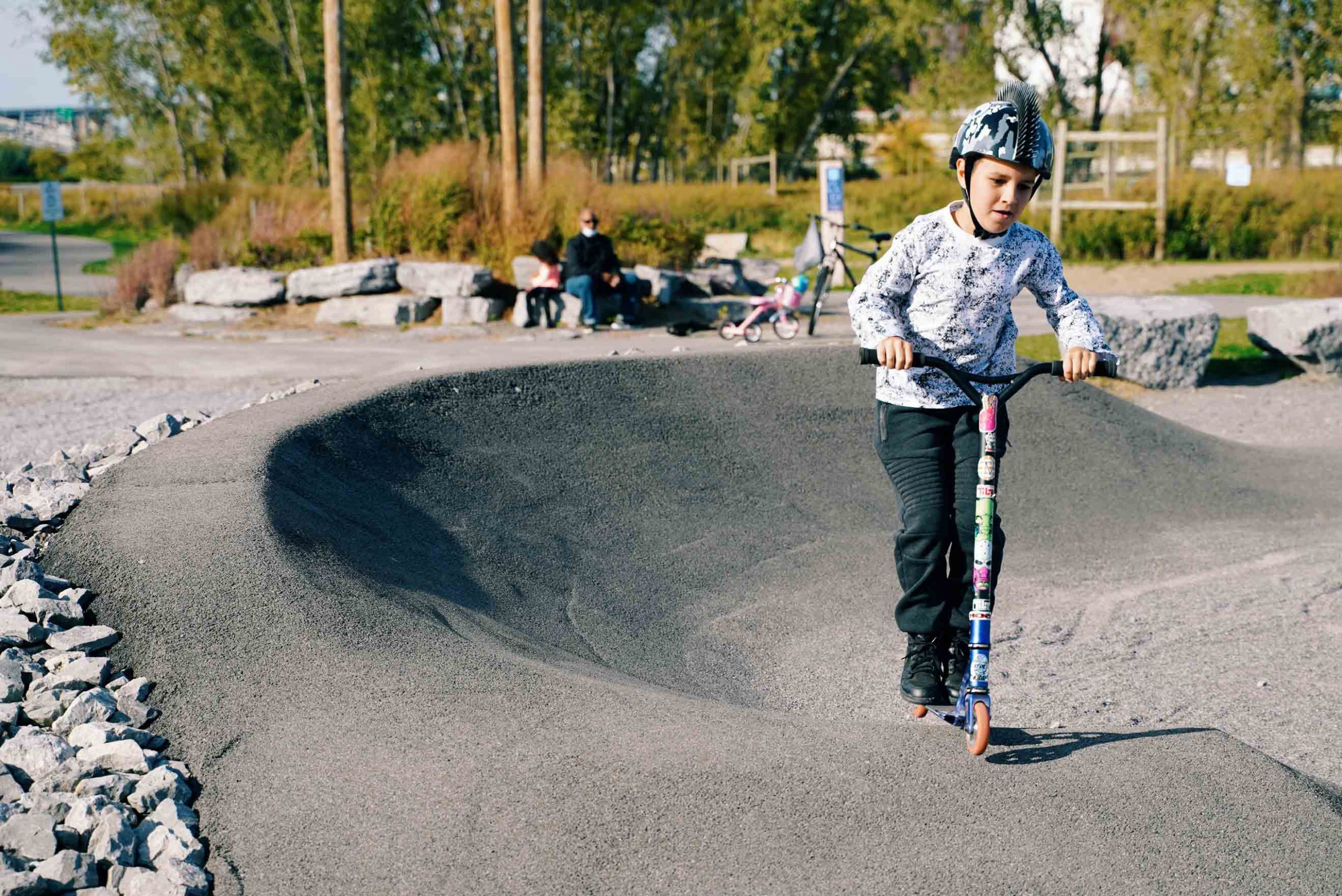 When you arrive, you’re immediately greeted by the two asphalt bike tracks. These include the Pump Track, a circuit of banked turns that are meant to be ridden while pumping your bike. The second asphalt track is the Tot Track. This is the perfect introductory course for the little ones that have finally wrenched off the training wheels. This loop within a loop beginners track features a small pump track within a larger perimeter track that is filled with pipe tunnels, banked turns, dips and inclines.