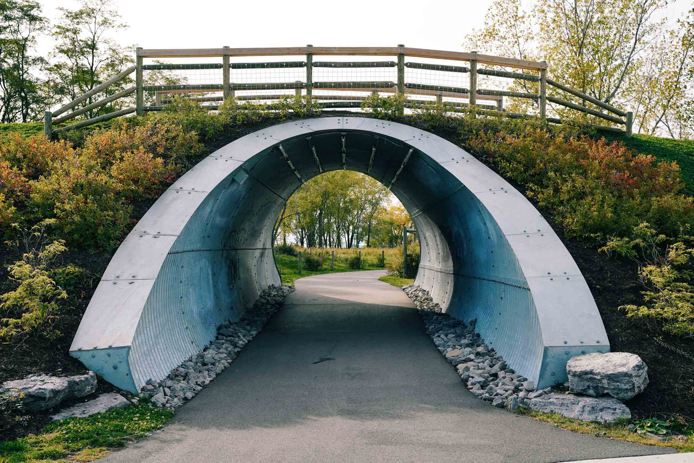 The mountain biking trails of Lakeside Bike Park feature tracks of progressing difficulty. Track One (.33 miles), cutting through the Pollinator Meadow and restored natural habitats, features banked trails and wooden ramps and boardwalks. Track Two (.34 miles) carves through rocky deposits with a climb to a roundabout that drops down to incredible views of Lake Erie. This track features skinnies and balance obstacles made from reclaimed docks and piers. Track Three (.34 miles) is narrow and winding, featuring banked reverse curves dropping into a set of tabletop balance obstacles.