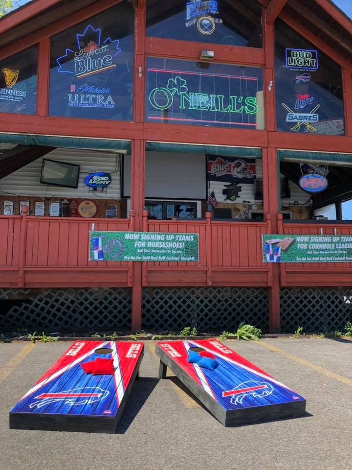 The Patio: You’re in Bills country now. In the off-season, you might see O’Neill’s patrons enjoying the summer sunshine on the patio, eating wings and gazing lovingly at Highmark Stadium across the street. But during football season, the patio is overflowing with members of Bills Mafia either filling their bellies for the game ahead or celebrating a ‘W’ with a round of wings and beer.