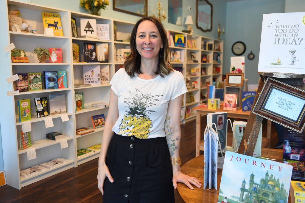 Megan grew up on a 32-acre farm in West Valley, a place of “hard work, but it was really, really fun.” She invented games with her siblings, slept under the stars, and, along the way saw the movie “You’ve Got Mail” that features a children’s bookstore prominently. “No one teaches you that opening a children’s bookstore is a career option,” says Megan. Soon after she began writing children’s literature and would earn education degrees, imagining her bookstore along the way.
