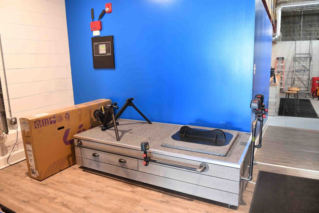 In the back is the Campus WheelWorks service department, outfitted with an impressive coffee bar. A natural question springs to mind: do people stop by for a coffee, and then feel obligated to purchase a bike? Between the showroom and service area is a homemade machine that Alex built; it fits riders to bikes. Customers and their selected model are placed on the platform where staff measures the proper fit of a bike’s frame to a rider’s.