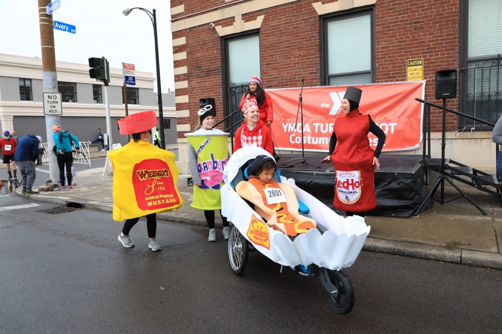 For those in costume, the planning process is as much a part of the quest as finishing the race. To create her first-place ensemble, Joan Golda joined forces with her cousin Madison Scheffler to use a wall projector to make big felt versions of beloved local brands — from own her getup as a bottle of Frank’s Hot Sauce to Scheffler’s can of Aunt Rosie’s Loganberry soda, a friend’s jar of Weber’s Mustard and the Sahlen’s hot dog logo on a ruffle around a friend’s daughter’s wheeled runner’s chair.