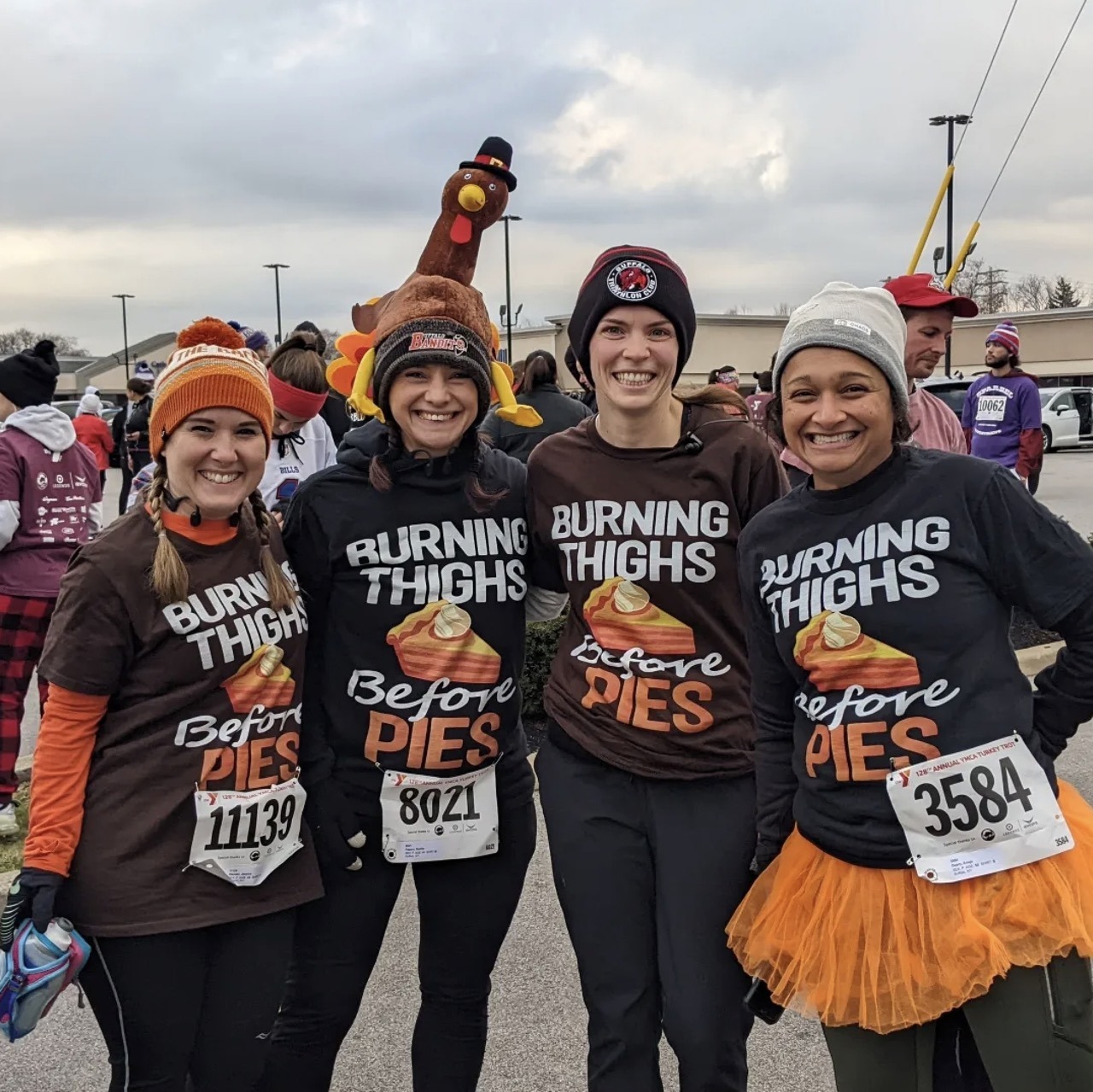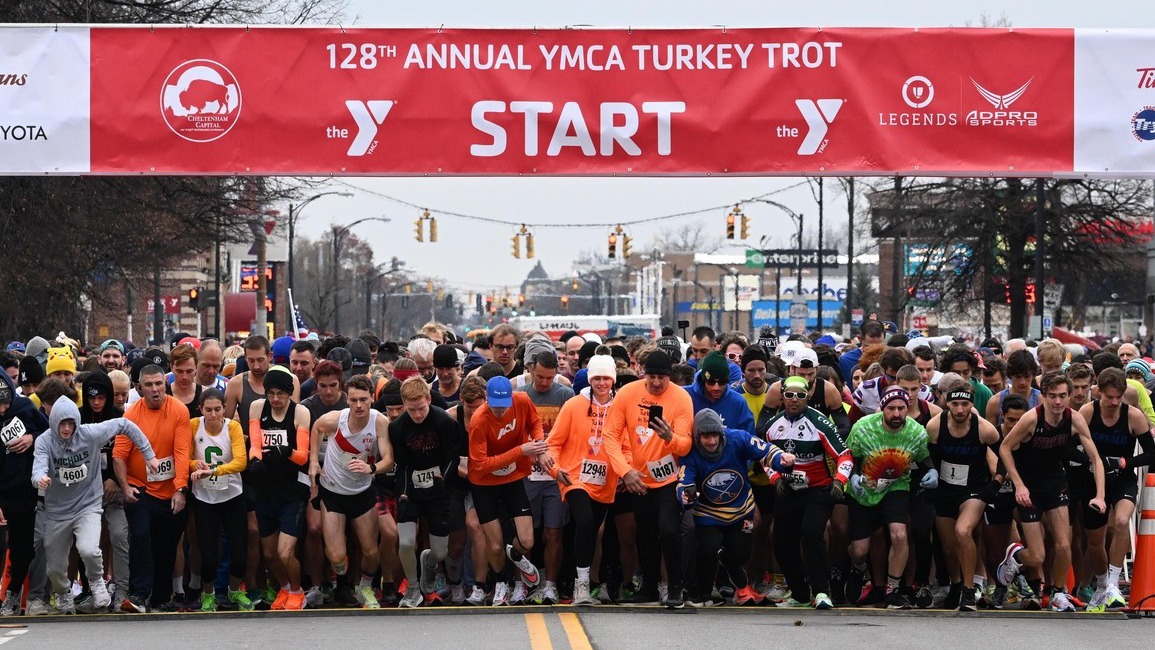 For at least 14,000 people, Thanksgiving in Buffalo starts in the morning with the Turkey Trot, the nation’s oldest, continuous road race, with runners and walkers coalescing into a costumed mass at the old brick YMCA Buffalo Niagara headquarters on Delaware Avenue. Holding paper cups of coffee that double as handwarmers, they wait for the pop of the 9 a.m. start gun in running gear, turkey hats, turkey socks, orange tutus, and fully costumed as turkeys, pilgrims, Santa Claus, elves and Christmas trees.