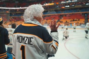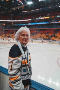 Standing next to them, quietly watching the players dart and scramble around the ice, is 95-year-old Anna Szczepanski of Cheektowaga, or, as she’s better known around the arena, “Momzie.” While the children soon returned to their seats around the arena for the game, “Momzie” was already at her front row seat, the same one she’s had for almost every Sabres home game since the arena opened in 1996.