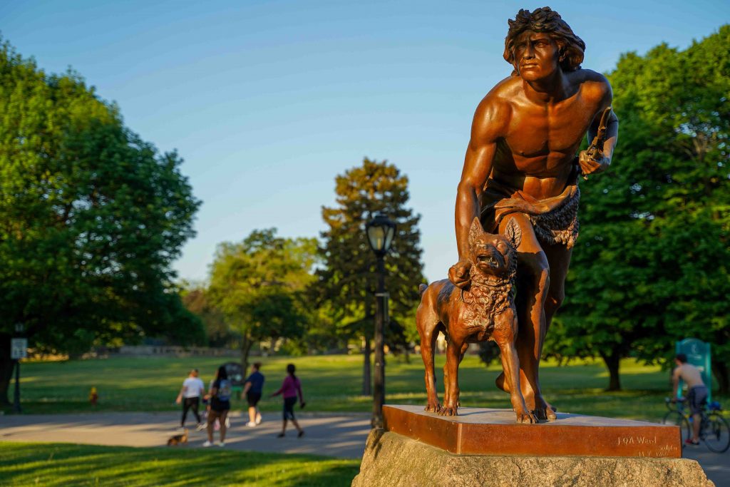 Speaking of dogs and art, round the bend as the Ring Road curves along Parkside Avenue and its array of comfortable homes, right across from the Parkside Lodge sign, observe the striking bronze statue on your left. Indian Hunter depicts a man clutching a bow and arrow with one hand, and the other on his hunting dog. What is this doing here? It is in fact a replica of a statue found in Central Park (mid-Park at 66th Street, if you find yourself in Manhattan). It was the first work which the American artist, John Quincy Adams Ward, contributed to Central Park. Dedicated in 1869, it is one of the oldest pieces of outdoor art on display in the Park. Ella Spencer Darr commissioned the replica for the City of Buffalo in memory of her husband Marcus M. Darr.