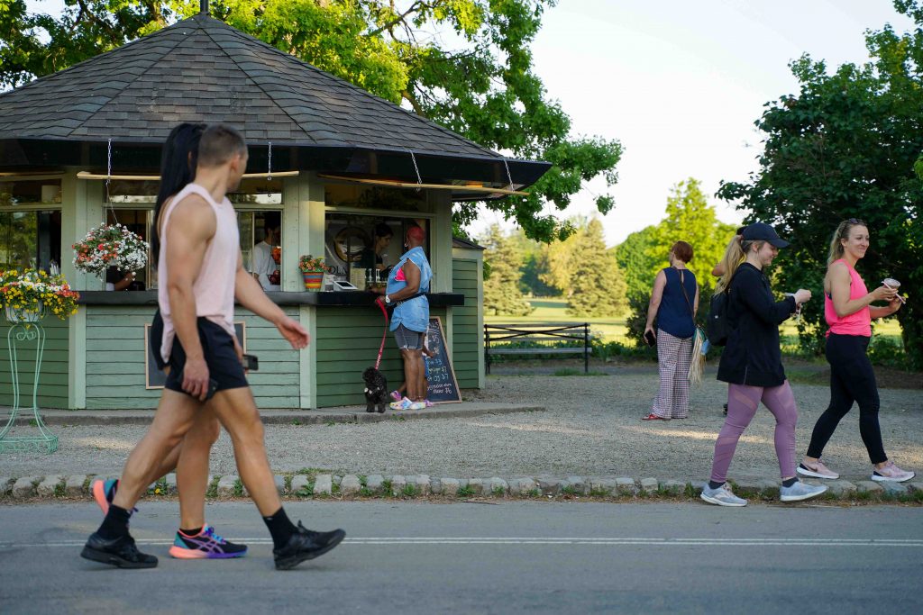 I like to start at the junction of Nottingham Terrace and Meadow Road. Enter the Park there and head right, toward the Scajaquada Expressway. On your left is the Juicery, a seasonal refreshment stand returning this year. Walk past the bleachers, always forlorn in winter, but filled with spectators and benchwarmers once again. Notice there are plenty of people around you, appropriately spaced in the fresh air. Intrepid runners, like tropical birds in their rainbow-hued compression tights. Don’t be daunted by the ones who keep running past—didn’t I just see him? How did she get around so quickly? Just different missions motivating us, and the Ring Road accommodates all.